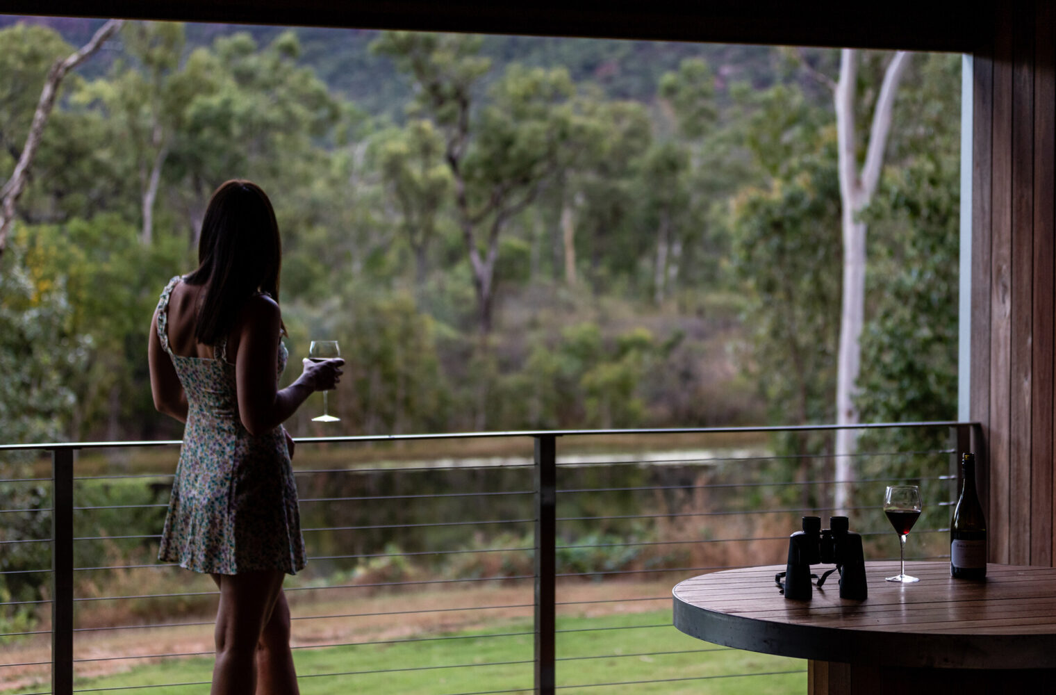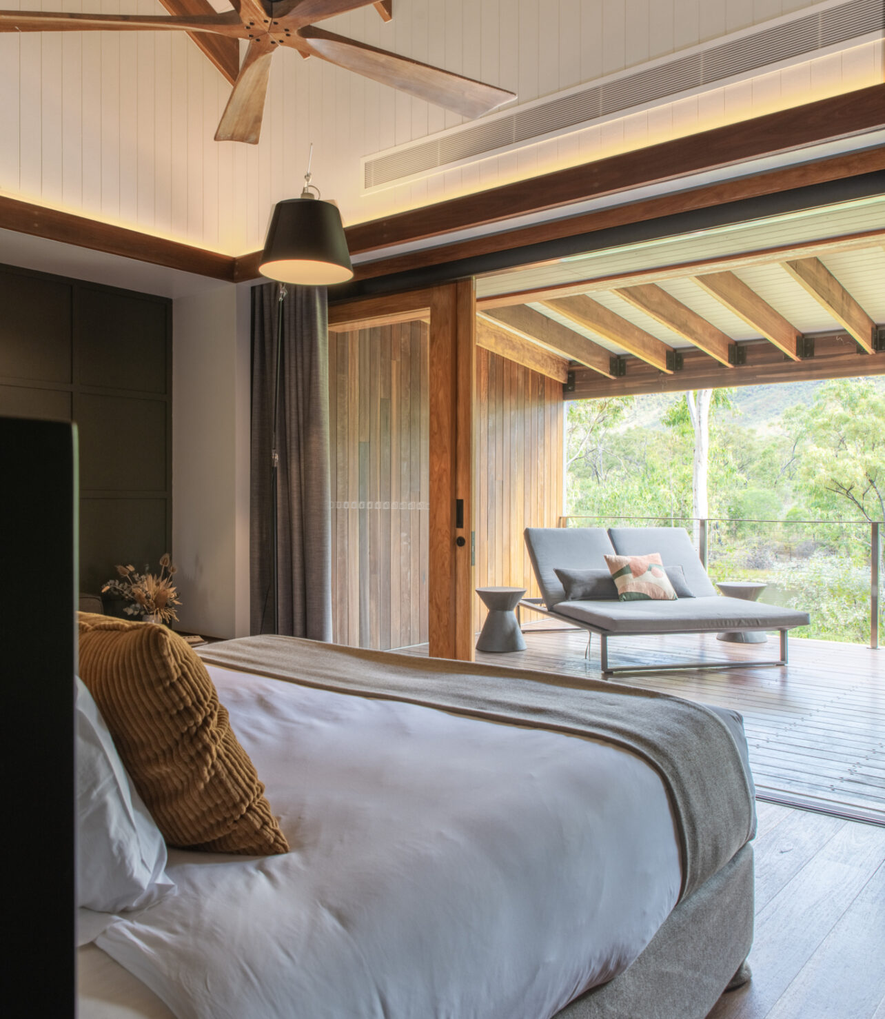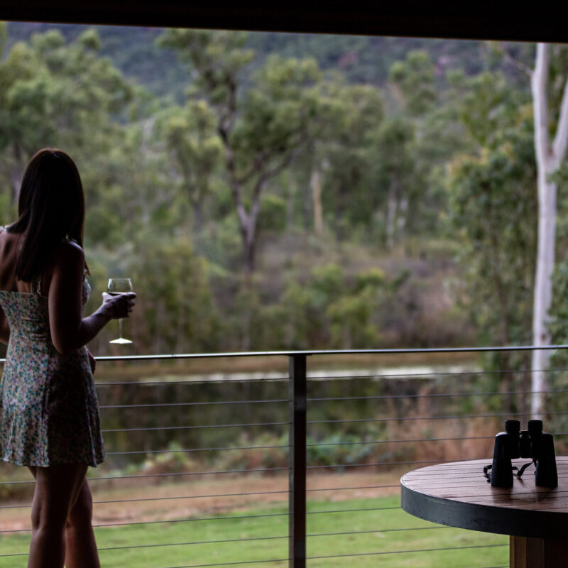 The ensuite bathroom is both luxurious and moody. Your private verandah, complete with outdoor furniture, overlooks the tranquil weir and the fiery rock face of Mount Mulligan.